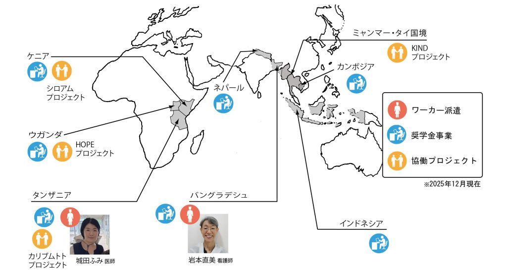 アジア・アフリカの国々の保健医療サービスを受けにくい地域で働く保健医療従事者に、奨学金支援を通して研修の機会を提供しています。研修後にその地域にとどまり、人々のために働きたいと願う人を奨学生として選んでいます。