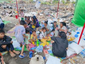 WTINDの代表であるデイビッド医師を中心とした医療チームは、マンダレーにある仏教寺院にキャンプを設置し医療活動をおこなうとともに、孤児145人および障がいのある子どもたち80人に対して食料支援をおこないました。デイビッド医師は、病院のベッドではなく地面に横たわり手当を受けている負傷者たちの姿に胸が締め付けられる思いだったと語っています。